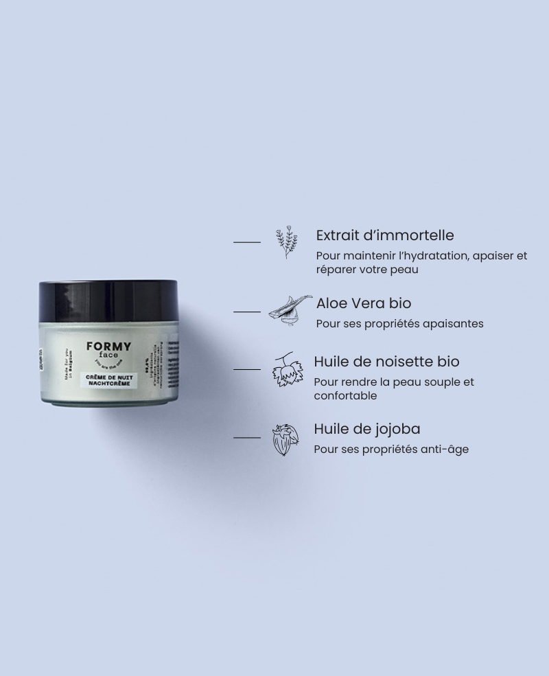 Ma crème de nuit est hydratante et réparatrice. Grâce à ses huiles, elle aide activement à apaiser et régénérer les cellules de la peau après une journée d’exposition.
