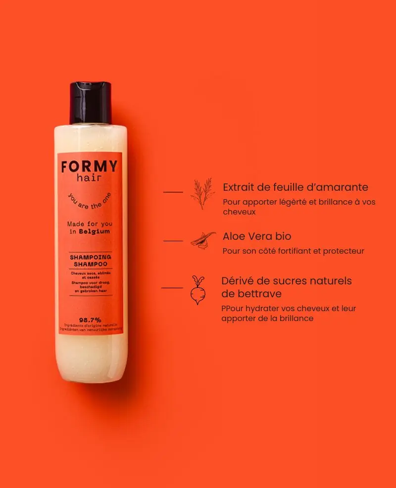 Mon shampooing pour cheveux secs, abîmés et cassés contient des extraits de feuilles d’amarante, une plante regorgeant d’antioxydants. Cet actif, l’ennemi des cheveux secs, améliore la qualité de vos cheveux. Il leur apporte de la légèreté, de l’hydratation et de la douceur.